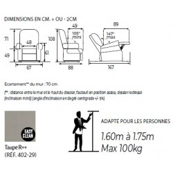 Fauteuil releveur 2 moteurs en tissu 100 % polyester "easy clean" facile à nettoyer à l'aide d'un choiffon / éponge absorbant, avec traitement déperlant pour éviter la pénétration immédiate des liquides.